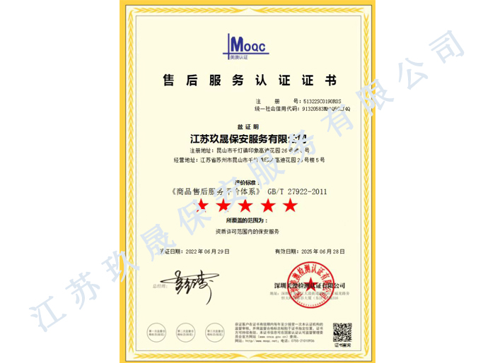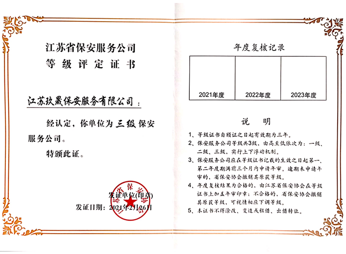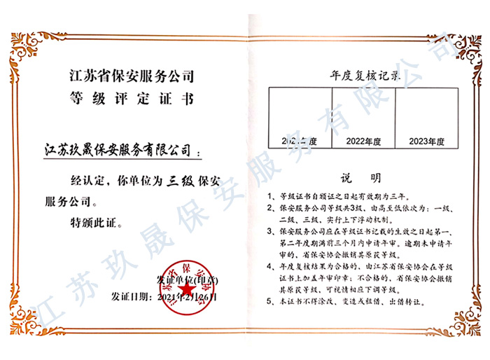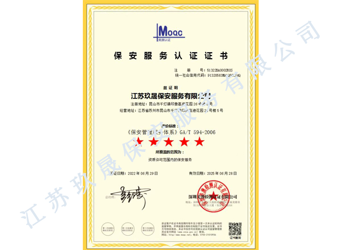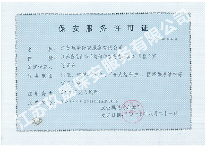 江蘇玖晟保安服務(wù)有限公司成立于江蘇省昆山市千燈鎮(zhèn)。注冊資金:2000萬,是擁有省公安廳頒發(fā)的保安服務(wù)許可證的企業(yè)【蘇公保服20170046】,也是昆山市保安協(xié)會常務(wù)理事單位。